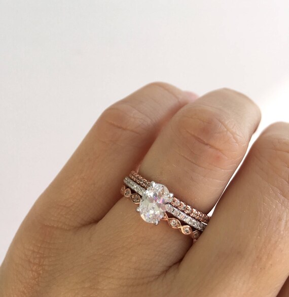 Bridal Ring Set Oval Cut Engagement Ring With 2 Rose Gold Wedding Bands Stacking Rings Rose Gold And Silver Wedding Ring Set
