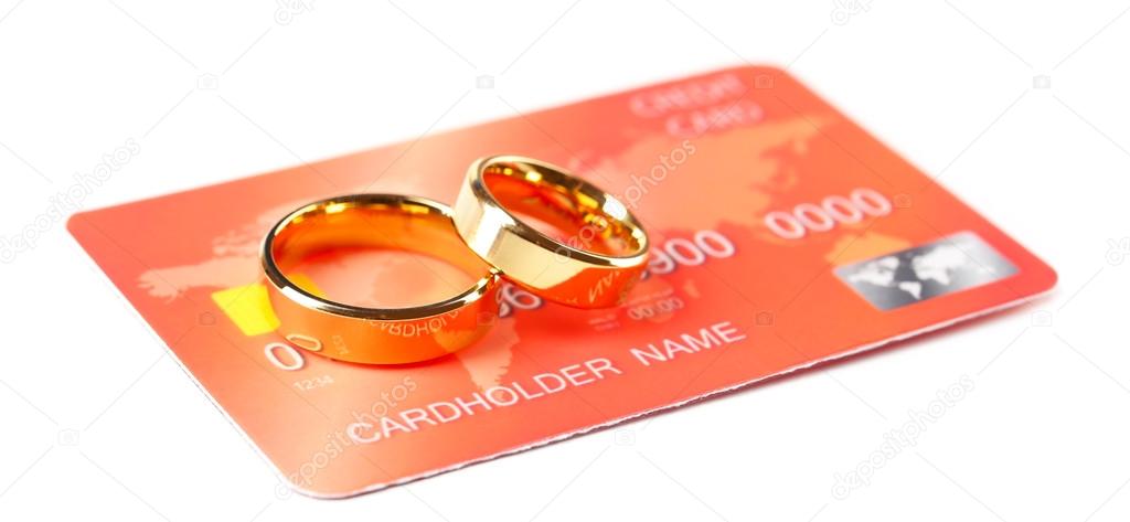 Golden Wedding Rings And Credit Card Isolated On White