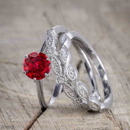 Unique 1 50 Carat Round Cut Ruby And Diamond Trio Wedding Ring Set In White Gold For Her